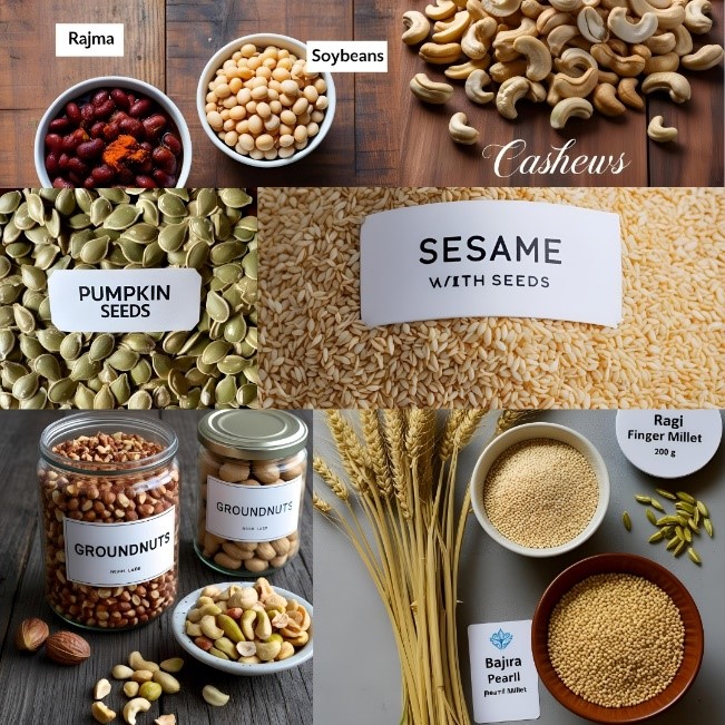 ✔️ Nuts & Seeds: Groundnuts (Kadale beeja), Sesame seeds (Ellu), Pumpkin seeds (Kumbalakai beeja), Cashews (Godambi) – Great in chutneys or as snacks.